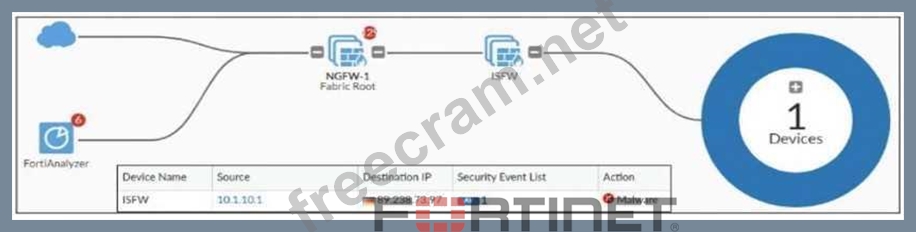 From the exhibit, ISFW is part of a Security Fabric environment with NGFW-1 as the Fabric Root. In this architecture, FortiGate devices share security intelligence, including logs and detected threats. ISFW is in a Security Fabric environment: Security Fabric allows devices like ISFW to receive threat intelligence from NGFW-1, even if UTM is not enabled locally. If NGFW-1 detects malware from IP 10.1.10.1 to 89.238.73.97, this information can be propagated to ISFW and FortiAnalyzer. The firewall policy in NGFW-1 has UTM enabled: Even though ISFW does not have UTM enabled, NGFW-1 (which sits between ISFW and the external network) does have UTM enabled and is scanning traffic. Since NGFW-1 detects malware in the session, it logs the event, which is then sent to FortiAnalyzer.