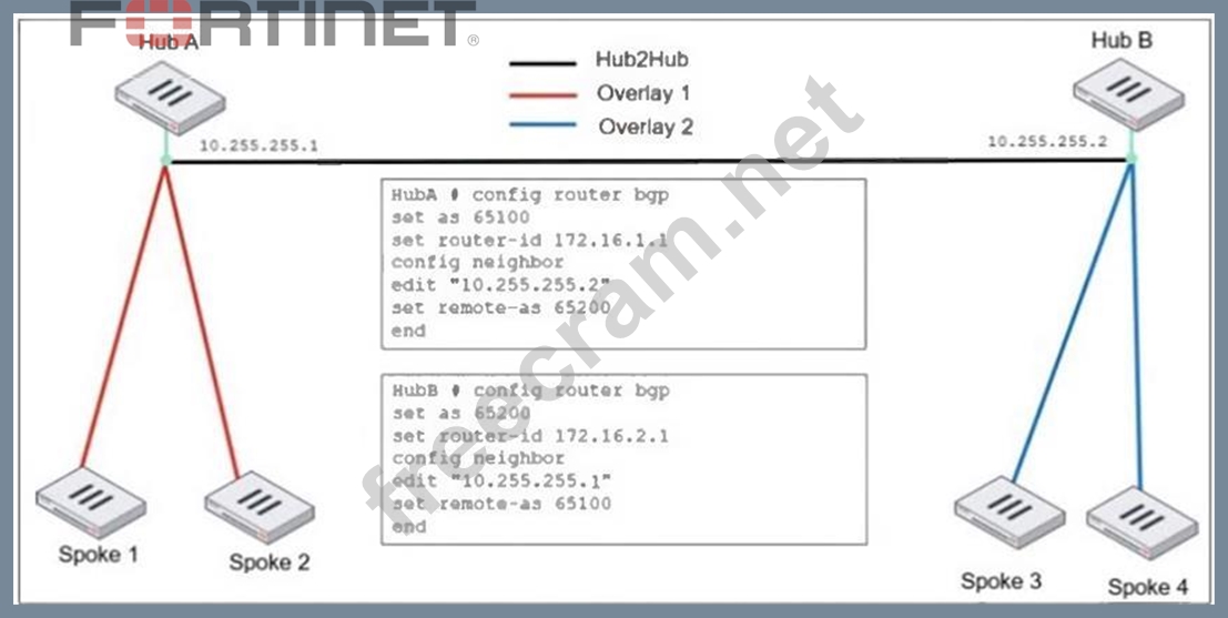 In this ADVPN (Auto-Discovery VPN) network, there are two hubs (Hub A and Hub B) connected via EBGP, while IBGP is used within each overlay. To ensure proper BGP routing between the overlays, the administrator must configure specific BGP options.. set ebgp-enforce-multihop enable By default, EBGP requires directly connected neighbors. Since Hub A and Hub B are not directly connected but reach each other over an IPsec tunnel, multihop must be enabled for EBGP sessions to work. set next-hop-self enable In IBGP, the next-hop attribute does not change by default. When an IBGP route is advertised from a spoke to another hub or spoke, the next-hop needs to be updated to ensure proper reachability. Enabling next-hop-self forces the BGP speaker to advertise itself as the next-hop, ensuring that all spokes properly reach routes across the overlays.