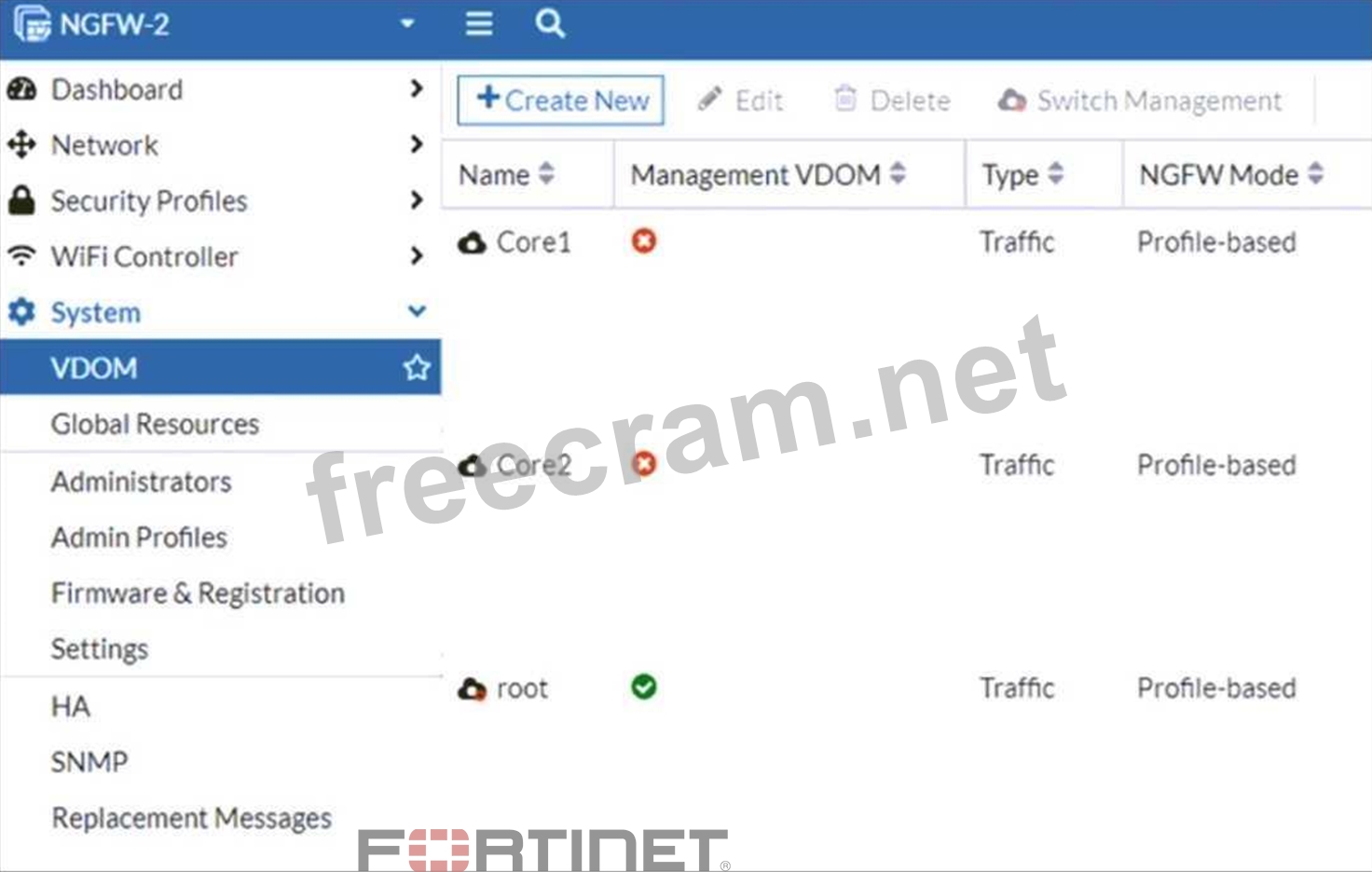 Refer to the exhibit, which shows the VDOM section of a FortiGate device.