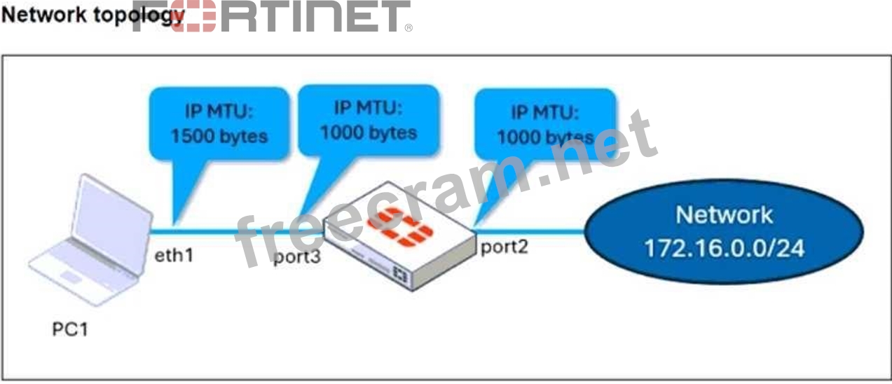 Refer to the exhibits. The configuration of a user's Windows PC, which has a default MTU of 1500 bytes, along with FortiGate interfaces set to an MTU of 1000 bytes, and the results of PC1 pinging server 172.16.0.254 are shown. Why is the user in Windows PC1 unable to ping server 172.16.0.254 and is seeing the message: Packet needs to be fragmented but DF set?