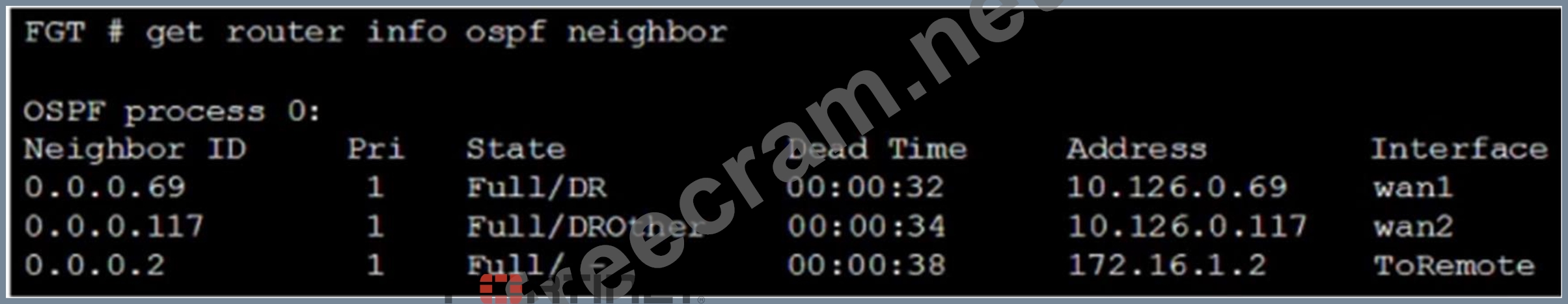 Question 38: Examine the output of the 'get router info ospf neighbor' co...