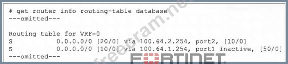 After adding the port3 default route (distance 50), the best active route remains the port2 static route (distance 20), so that port2 entry stays installed in the FIB. The port1 route remains inactive and is not installed.