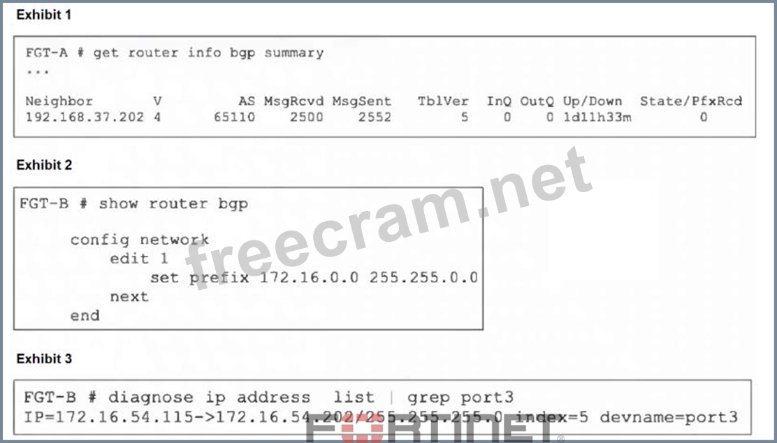 BGP's network statement only advertises prefixes that exactly match routes in the RIB by default. Since port3 is 172.16.54.0/24, changing the prefix to 172.16.54.0/24 ensures it's in the routing table and will be advertised. You can disable the network import check global (or per prefix) setting so FortiGate will advertise the 172.16.0.0/16 prefix even though no matching route exists in the RIB.