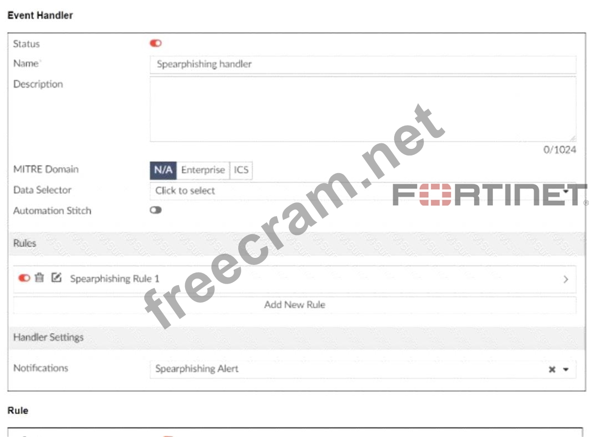 * Understanding the Event Handler Configuration: * The event handler is set up to detect specific security incidents, such as spearphishing, based on logs forwarded from other Fortinet products like FortiSandbox. * An event handler includes rules that define the conditions under which an event should be triggered. * Analyzing the Current Configuration: * The current event handler is named "Spearphishing handler" with a rule titled "Spearphishing Rule 1". * The log viewer shows that logs are being forwarded by FortiSandbox but no events are generated by FortiAnalyzer. * Key Components of Event Handling: * Log Type: Determines which type of logs will trigger the event handler. * Data Selector: Specifies the criteria that logs must meet to trigger an event. * Automation Stitch: Optional actions that can be triggered when an event occurs. * Notifications: Defines how alerts are communicated when an event is detected. * Issue Identification: * Since FortiSandbox logs are correctly forwarded but no event is generated, the issue likely lies in the data selector configuration or log type matching. * The data selector must be configured to include logs forwarded by FortiSandbox. * Solution: * B. Configure a FortiSandbox data selector and add it to the event handler: * By configuring a data selector specifically for FortiSandbox logs and adding it to the event handler, FortiAnalyzer can accurately identify and trigger events based on the forwarded logs. * Steps to Implement the Solution: * Step 1: Go to the Event Handler settings in FortiAnalyzer. * Step 2: Add a new data selector that includes criteria matching the logs forwarded by FortiSandbox (e.g., log subtype, malware detection details). * Step 3: Link this data selector to the existing spearphishing event handler. * Step 4: Save the configuration and test to ensure events are now being generated. * Conclusion: * The correct configuration of a FortiSandbox data selector within the event handler ensures that FortiAnalyzer can generate events based on relevant logs. References: * Fortinet Documentation on Event Handlers and Data Selectors FortiAnalyzer Event Handlers * Fortinet Knowledge Base for Configuring Data Selectors FortiAnalyzer Data Selectors By configuring a FortiSandbox data selector and adding it to the event handler, FortiAnalyzer will be able to accurately generate events based on the appropriate logs.