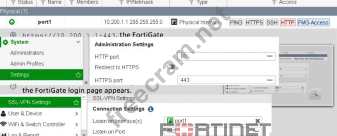 B. When a remote user accesses https://10.200.1.1:443, the FortiGate login page appears.