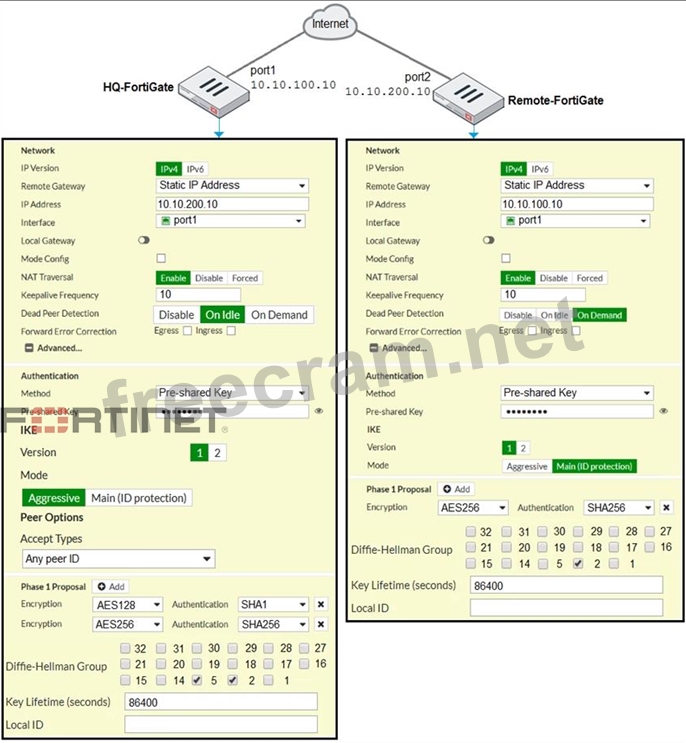 Based on the phase 1 configuration and the diagram shown in the exhibit, which two configuration changes will bring phase 1 up? (Choose two.)