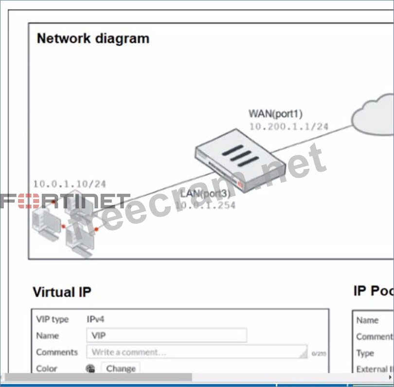 The exhibit contains a network diagram, virtual IP, IP pool, and firewall policies configuration.