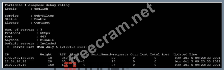Question 38: Refer to the exhibit. Refer to the FortiGuard connection deb...