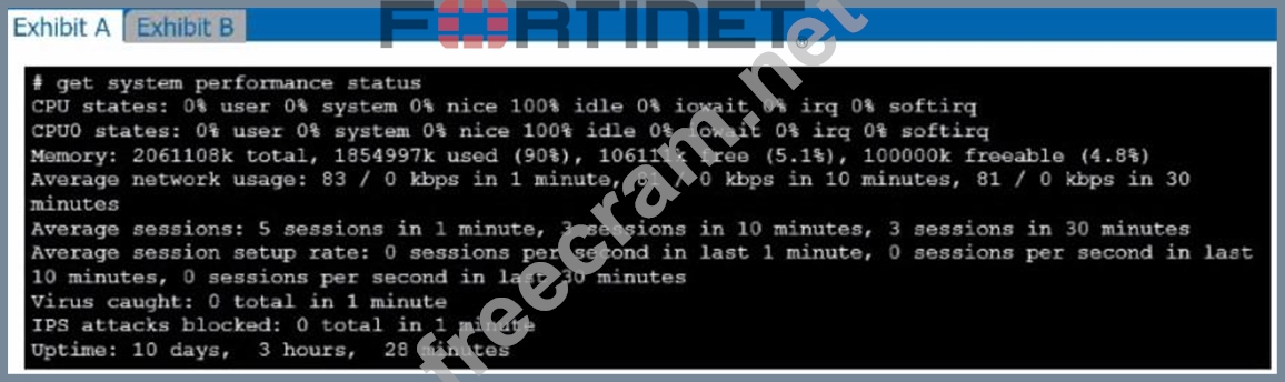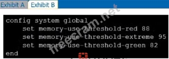 Refer to the exhibits. Exhibit A shows system performance output. Exhibit B shows a FortiGate configured with the default configuration of high memory usage thresholds. Based on the system performance output, which two statements are correct? (Choose two.)