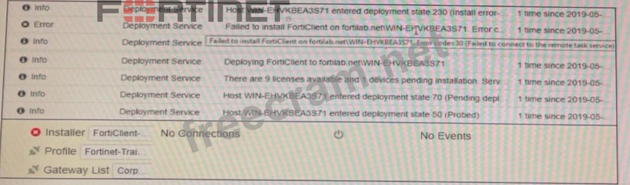 Based on the logs shown in the exhibit, why did FortiClient EMS fail to install FortiClient on the endpoint?