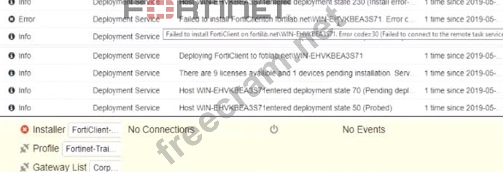 Based on the logs shown in the exhibit, why did FortiClient EMS fail to install FortiClient on the endpoint?