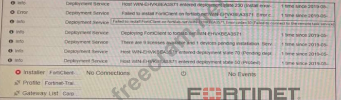 Based on the logs shown in the exhibit, why did FortiClient EMS fail to install FortiClient on the endpoint?