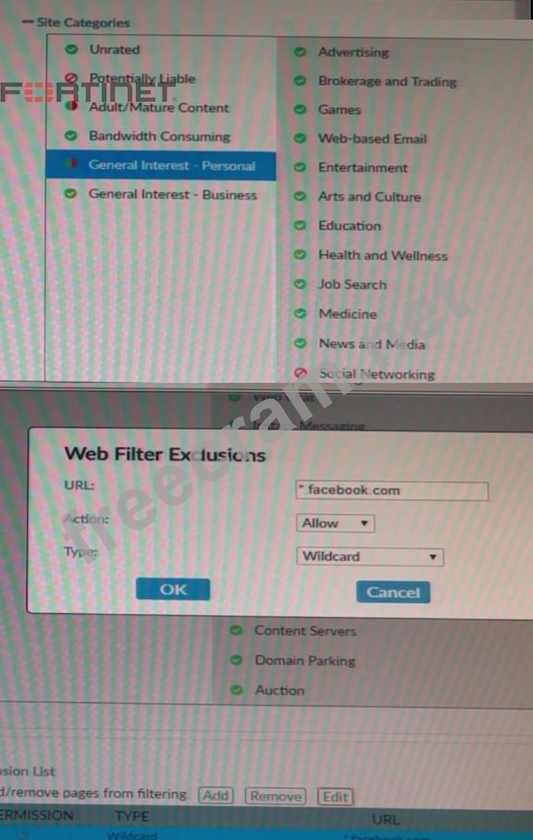 Based on the settings shown in the exhibit, which action will FortiClient take when users try to accesswww.facebook.com?