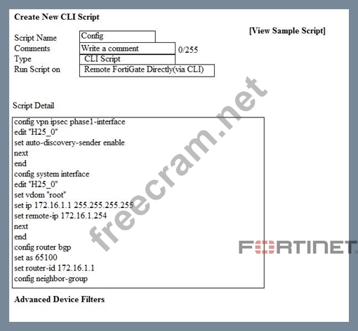 Which two statements are true if the script is executed using the Remote FortiGate Directly (via CLI) option? (Choose two.)