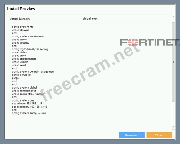 An administrator created a new system template named Training with two new DNS addresses on FortiManager. During the installation preview stage, the administrator notices that many unset commands need to be pushed.