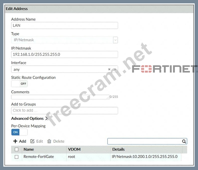 Refer to the exhibit. An administrator has created a firewall address object,Trainingwhich is used in the Local-FortiGate policy package. When the installation operation is performed, which IP/Netmask will be installed on the Local-FortiGate, for theTrainingfirewall address object?