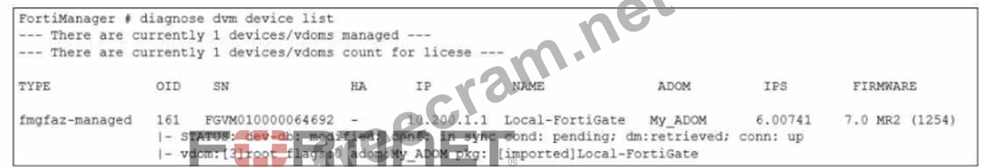 "conf: in sync" means FortiGate configuration is in sync with the latest running revision history. "db: modified" and "cond: pending" means that changes have been made to the device-level settings and need to be installed. The example on this slide shows that the FortiGate configuration is in sync with the latest running revision history. However, changes have been made to the device-level settings. That is why the CLI output is showing db:modified and the cond is showing as pending. After you install the changes on FortiGate, it will show db: not modified and cond:OK. db:modified = Config changes made on FMG cond:in sync = Latest revision history in sync with FGT running-config cond:pending = Config changes needed to be installed Reference [Page 160] - https://ebin.pub/fortinet-fortimanager-study-guide-for-fortimanager-72.html