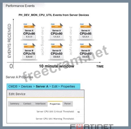 Three events are collected over a 10-minute time period from two servers: Server A and Server B.