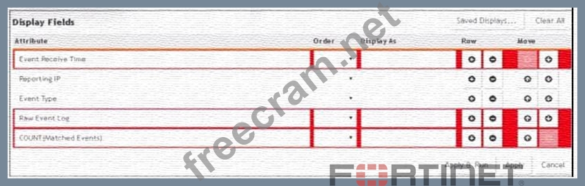 Grouping Attributes in Reports: When creating reports in FortiSIEM, certain attributes can be grouped to summarize and organize the data. Unique Attributes: Attributes that are unique for each event cannot be grouped because they do not provide a meaningful aggregation or summary. Red Highlighting Explanation: The red highlighting in the exhibit indicates attributes that cannot be grouped together due to their unique nature. These unique attributes includeEvent Receive Time,Reporting IP,Event Type,Raw Event Log, andCOUNT(Matched Events). Attribute Characteristics: * Event Receive Timeis unique for each event. * Reporting IPandEvent Typecan vary greatly, making grouping them impractical in this context. * Raw Event Logrepresents the unprocessed log data, which is also unique. * COUNT(Matched Events)is a calculated field, not suitable for grouping. References: FortiSIEM 6.3 User Guide, Reporting section, explains the constraints on grouping attributes in reports.