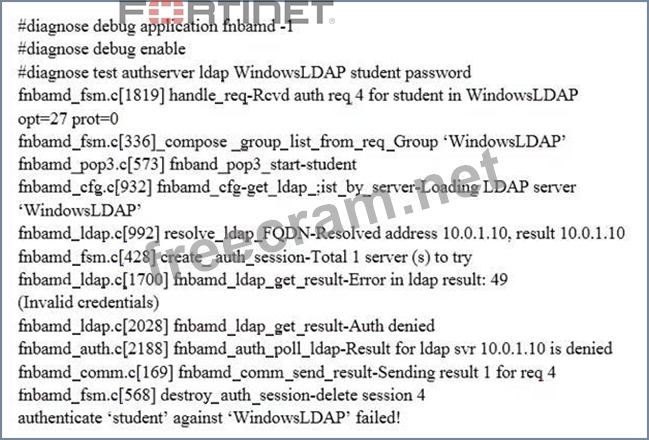 The LDAP user student cannot authenticate. The exhibit shows the output of the authentication real time debug while testing the student account: