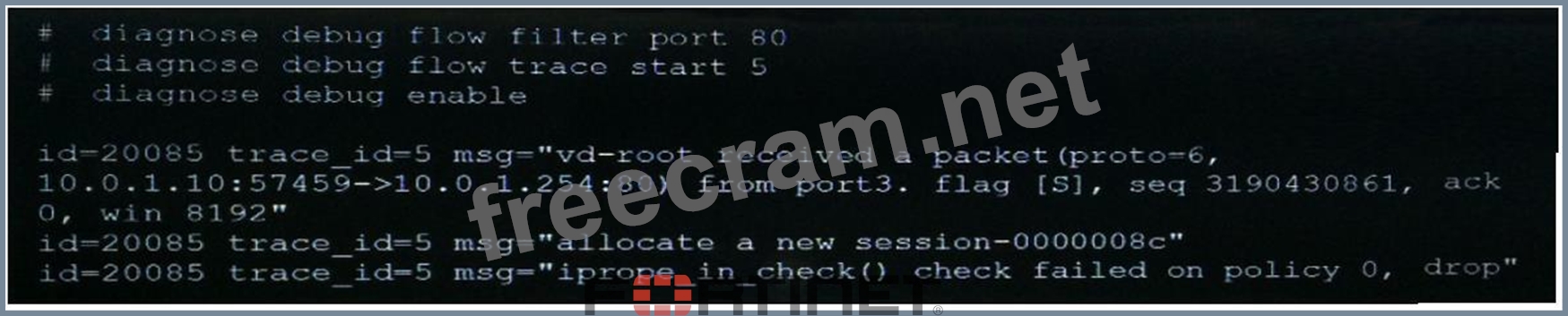 An administrator cannot connect to the GIU of a FortiGate unit with the IP address 10.0.1.254. The administrator runs thedebug flow while attempting the connection using HTTP. The output of the debug flow is shown in the exhibit: