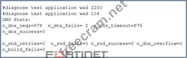 A FortiGate is configured as an explicit web proxy. Clients using this web proxy are reposting DNS errors when accessing any website. The administrator executes the following debug commands and observes that the n-dns-timeout counter is increasing: