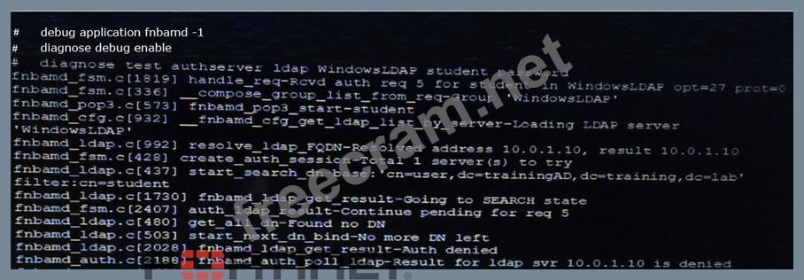 An LDAP user cannot authenticate against a FortiGate device. Examine the real time debug output shown in the exhibit when the user attempted the authentication; then answer the question below.