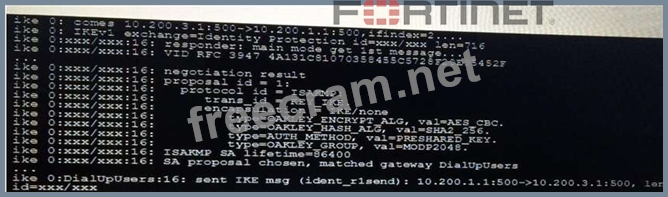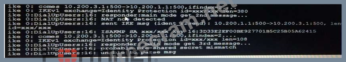 However, the phase 1 negotiation is failing. The administrator executed the IKF real time debug while attempting the Ipsec connection. The output is shown in the exhibit.