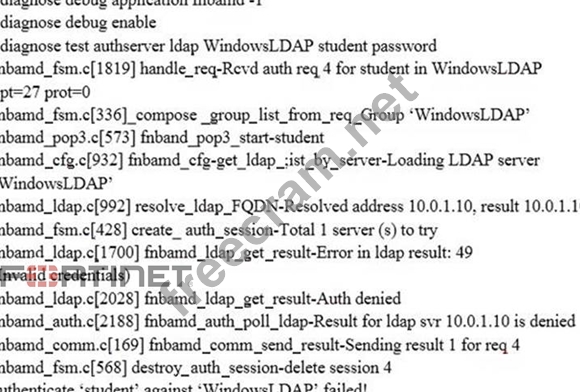 Question 1: An LDAP user cannot authenticate against a FortiGate device....