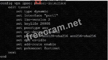 The configuration line "set dpd on-idle" indicates that dead peer detection (DPD) is set to trigger only when the tunnel is idle, not actively disabled1. References: FortiGate IPSec VPN User Guide - Fortinet Document Library From the given VPN configuration, dead peer detection (DPD) is set to 'on-idle', indicating that DPD is enabled and will be used to detect if the other end of the VPN tunnel is still alive when no traffic is detected. Hence, option C is incorrect. The configuration shows the tunnel set to type 'dynamic', which does not create separate virtual interfaces for each dial-up client (A), and it is not specified that dynamic routing will be used (B). Since this is a phase 1 configuration snippet, the routing table aspect (D) cannot be concluded from this alone.