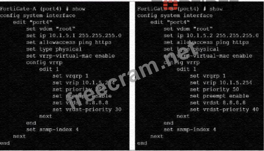 The Virtual Router Redundancy Protocol (VRRP) configuration in the exhibit indicates that 10.1.5.254 is set as the virtual IP (VRIP), commonly serving as the default gateway for the internal network (A). With vrrp-virtual-macenabled, both FortiGates would use the same virtual MAC address, ensuring a seamless transition during failover (B). The VRRP domain does not use the physical MAC address (C), and the priority settings indicate that FortiGate-A would be the primary router by default due to its higher priority (D).