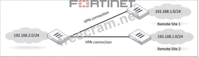 To ensure that only one remote site is connected at any given time in an IPsec VPN scenario, you should use route-overlapwith the option to either use-new or use-old. This setting dictates which routes are preferred and how overlaps in routes are handled, allowing for one connection to take precedence over the other (C). References: * FortiOS Handbook - IPsec VPN