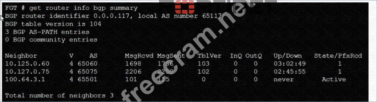 The output of the BGP (Border Gateway Protocol) summary shows details about the BGP neighbors of a router, their Autonomous System (AS) numbers, the state of the BGP session, and other metrics like messages received and sent. From the BGP summary provided: A).External BGP (EBGP) exchanges routing information.This conclusion can be inferred because the AS numbers for the neighbors are different from the local AS number (65117), which suggests that these are external connections. B).The BGP session with peer 10.127.0.75 is established.This is indicated by the state/prefix received column showing a numeric value (1), which typically means that the session is established and a number of prefixes has been received. C).The router 100.64.3.1 has the parameter bfd set to enable.This cannot be concluded directly from the summary without additional context or commands specifically showing BFD (Bidirectional Forwarding Detection) configuration. D).The neighbors displayed are linked to a local router with the neighbor-range set to a value of 4.The neighbor-range concept does not apply here; the value 4 in the 'V' column stands for the BGP version number, which is typically 4.