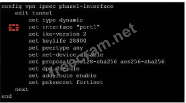 The configuration line "set dpd on-idle" indicates that dead peer detection (DPD) is set to trigger only when the tunnel is idle, not actively disabled1. References: FortiGate IPSec VPN User Guide - Fortinet Document Library From the given VPN configuration, dead peer detection (DPD) is set to 'on-idle', indicating that DPD is enabled and will be used to detect if the other end of the VPN tunnel is still alive when no traffic is detected. Hence, option C is incorrect. The configuration shows the tunnel set to type 'dynamic', which does not create separate virtual interfaces for each dial-up client (A), and it is not specified that dynamic routing will be used (B). Since this is a phase 1 configuration snippet, the routing table aspect (D) cannot be concluded from this alone.