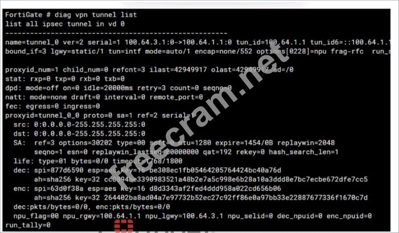 From the command output shown in the exhibit: B: The IKE version is 2: This can be deduced from the presence of 'ver=2' in the output, which indicates that IKEv2 is being used. C: Both IPsec SAs are loaded on the kernel: This is indicated by the line 'npu flags=0x0/0', suggesting that no offload to NPU is occurring, and hence, both Security Associations are loaded onto the kernel for processing. Fortinet documentation specifies that the version of IKE (Internet Key Exchange) used and the loading of IPsec Security Associations can be verified through the diagnostic commands related to VPN tunnels.