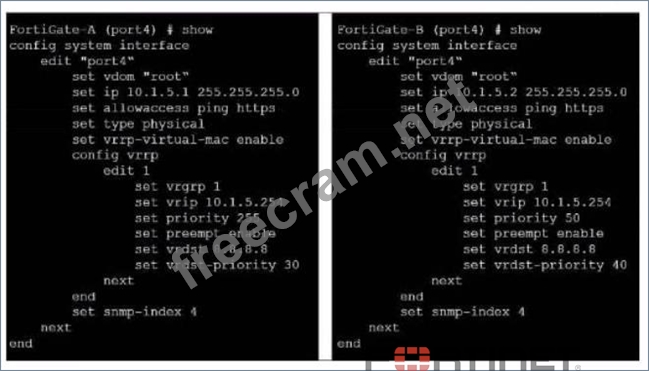 The Virtual Router Redundancy Protocol (VRRP) configuration in the exhibit indicates that 10.1.5.254 is set as the virtual IP (VRIP), commonly serving as the default gateway for the internal network (A). Withvrrp- virtual-macenabled, both FortiGates would use the same virtual MAC address, ensuring a seamless transition during failover (B). The VRRP domain does not use the physical MAC address (C), and the priority settings indicate that FortiGate-A would be the primary router by default due to its higher priority (D).