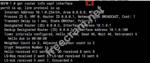 From the OSPF interface command output, we can conclude that the port3 network has more than one OSPF router because the Neighbor Count is 2, indicating the presence of another OSPF router besides NGFW-1. Additionally, we can deduce that the interfaces of the OSPF routers match the MTU value configured as 1500, which is necessary for OSPF neighbors to form adjacencies. The MTU mismatch would prevent OSPF from forming a neighbor relationship. References: * Fortinet FortiOS Handbook: OSPF Configuration