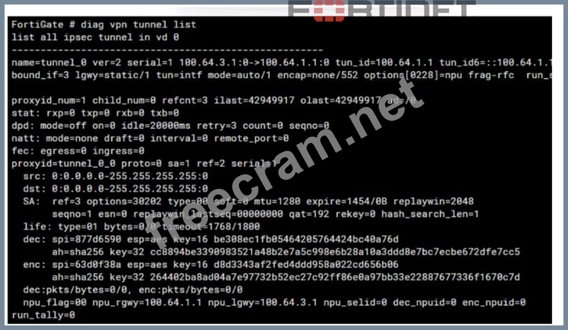 From the command output shown in the exhibit: B: The IKE version is 2: This can be deduced from the presence of 'ver=2' in the output, which indicates that IKEv2 is being used. C: Both IPsec SAs are loaded on the kernel: This is indicated by the line 'npu flags=0x0/0', suggesting that no offload to NPU is occurring, and hence, both Security Associations are loaded onto the kernel for processing. Fortinet documentation specifies that the version of IKE (Internet Key Exchange) used and the loading of IPsec Security Associations can be verified through the diagnostic commands related to VPN tunnels.
