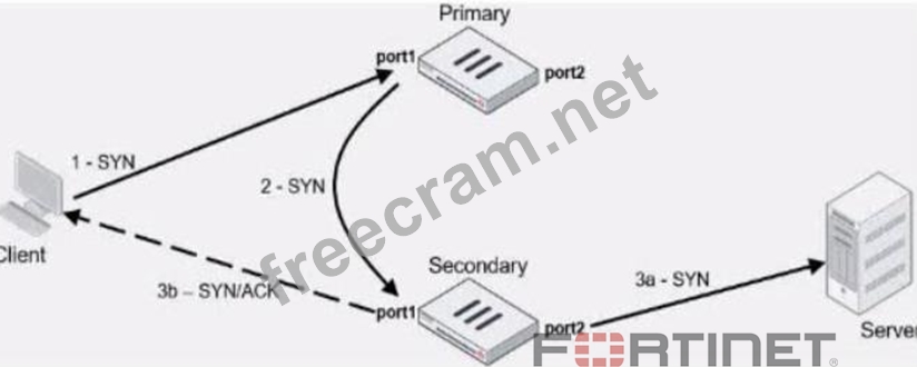 Exhibit. Refer to the exhibit, which contains an active-active toad balancing scenario. During the traffic flow the primary FortiGate forwards the SYN packet to the secondary FortiGate. What is the destination MAC address or addresses when packets are forwarded from the primary FortiGate to the secondary FortiGate?