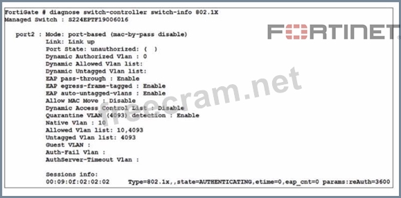 Refer to the exhibit A device connected to port2 on FortiSwitch cannot access the network The port is assigned a security policy to enforce 802 1X authentication While troubleshooting the issue, the administrator obtains the debug output shown in the exhibit Which two scenarios are likely to cause this issue? (Choose two.)