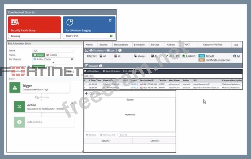 Refer to the exhibit. Examine the FortiGate configuration FortiAnalyzer logs and FortiGate widget shown in the exhibit An administrator is testing the Security Fabric quarantine automation The administrator added FortiAnalyzer to the Security Fabric and configured an automation stitch to automatically quarantine compromised devices The test device (::.:.:.!) s connected to a managed Fort Switch dev :e After trying to access a malicious website from the test device, the administrator verifies that FortiAnalyzer has a log (or the test connection However the device is not getting quarantined by FortiGate as shown in the quarantine widget Which two scenarios are likely to cause this issue? (Choose two)