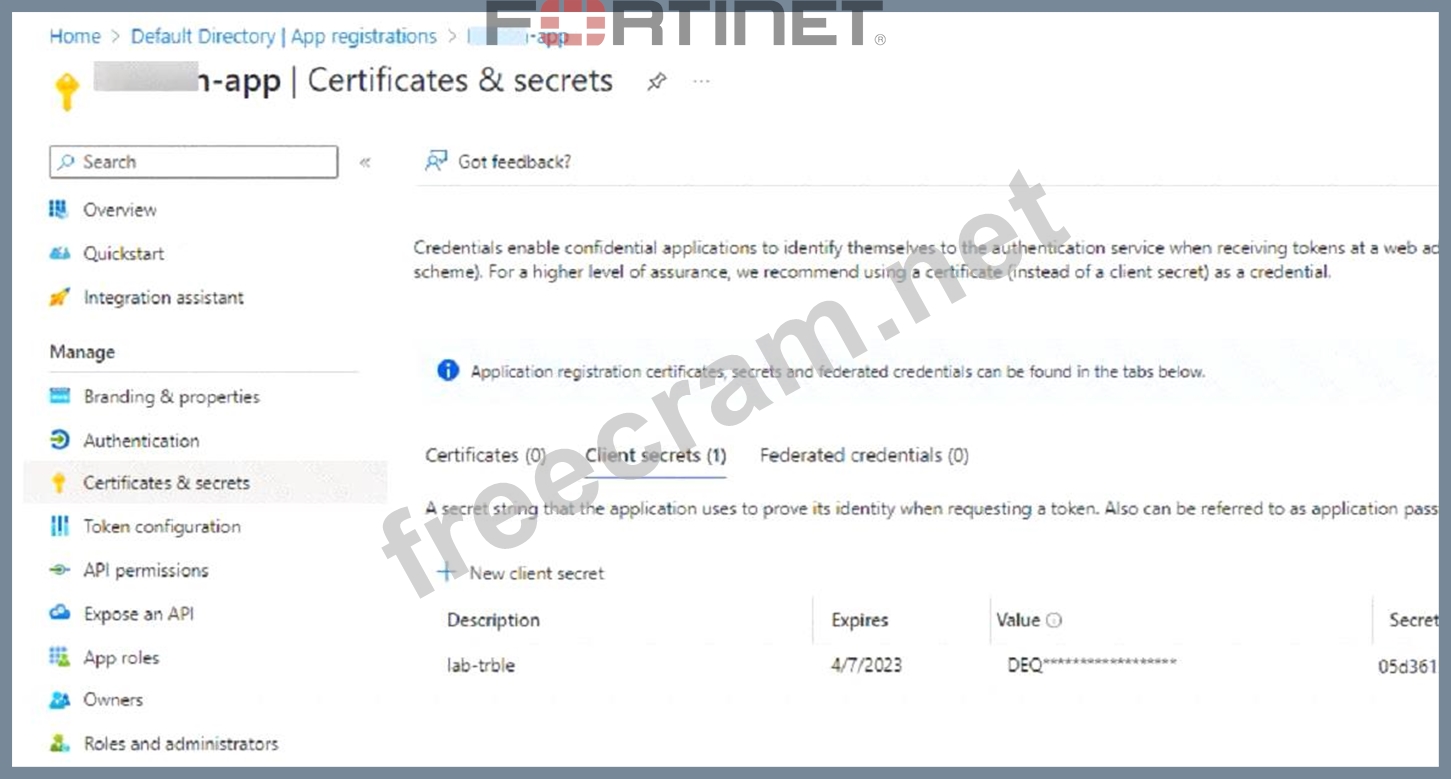 Refer to the exhibit An administrator is trying to deploy a FortiGate VM in Microsoft Azure using Terraform However, during the configuration, the Azure client secret is no longer visible in the Azure portal. How would the administrator obtain the Azure client secret to configure on Terratorm?