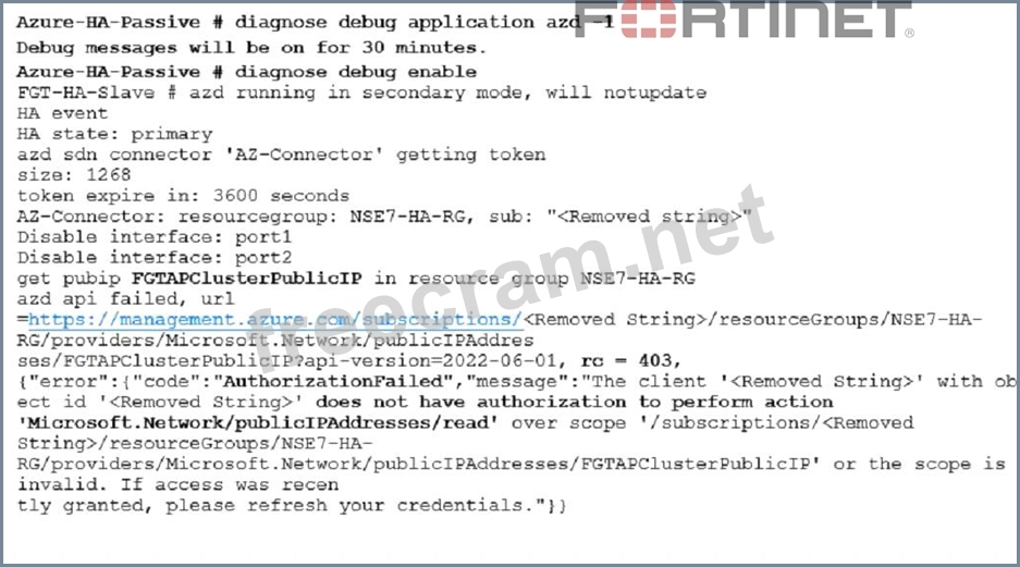 Explanation In this scenario, the issue is caused by the Azure service principle account nothaving a contributor role. This is required for the FortiGate HA floating IP to work properly. Without this role, the new primary device will not have the previous primary device floating IP address after failover. References: Fortinet Public Cloud Security knowledge source documents or study guide. https://docs.fortinet.com/product/fortigate-public-cloud/7.2