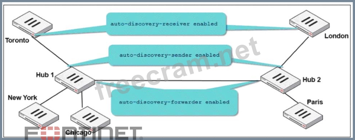Two hub-and-spoke groups are connected through a site-to-site IPsec VPN between Hub 1 and Hub 2. The administrator configured ADVPN on both hub-and-spoke groups. Which two outcomes are expected if a user in Toronto sends traffic to London? (Choose two.)
