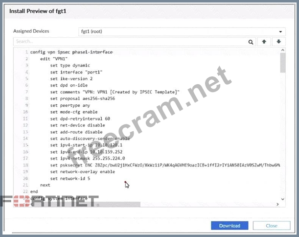 Refer to the exhibit. An administrator used the SD-WAN overlay template to prepare an IPsec configuration for a hub-and-spoke SD-WAN topology. The exhibit shows the installation preview for one FortiGate device. In the exhibit, which statement best describes the configuration applied to the FortiGate device?