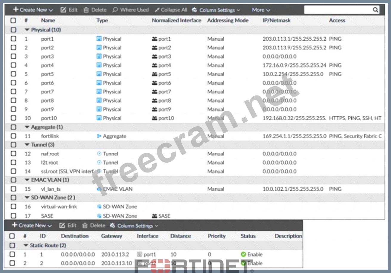 Exhibit B - Exhibit A shows the system interface with the static routes and exhibit B shows the firewall policies on the managed FortiGate. Based on the FortiGate configuration shown in the exhibits, what issue might you encounter when creating an SD-WAN zone for port1 and port2?