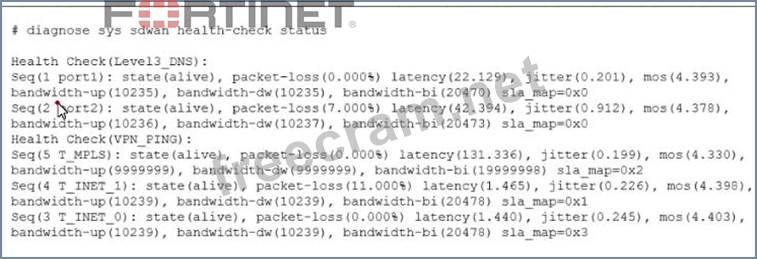 The exhibit shows the output of the command diagnose sys sdwan health-check status collected on a FortiGate device. Which two statements are correct about the health check status on this FortiGate device? (Choose two.)