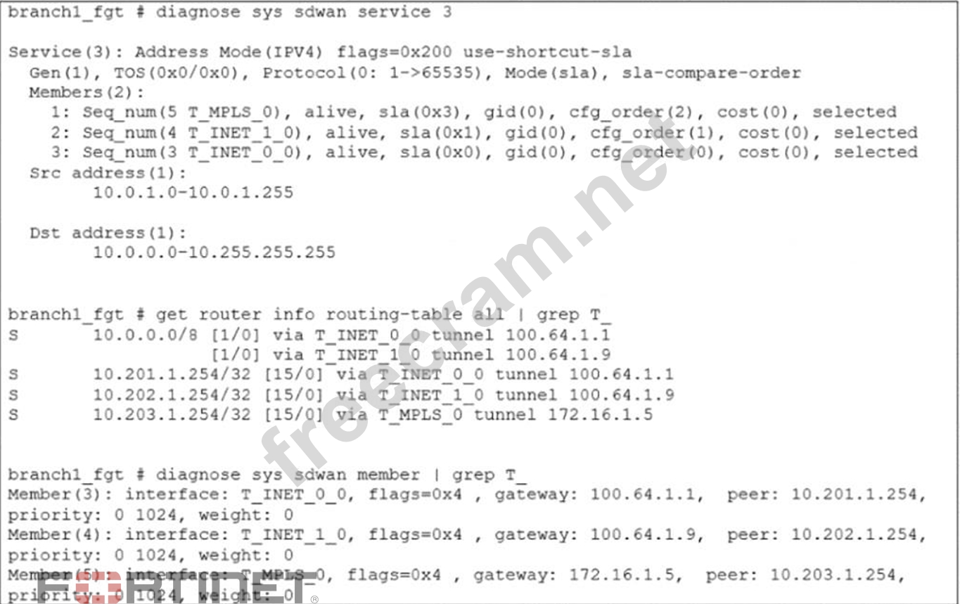 Exhibit A shows the configuration for an SD-WAN rule and exhibit B shows the respective rule status, the routing table, and the member status.