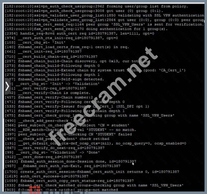 Given the output showing a real-time debug, the statement that describes the login failure is: C: student is not part of the usergroup SSL_VPN_Users: The debug log contains a line that says "fnbam_cert_check_group_list-checking group with name 'SSL_VPN_Users'" followed by "peer_check_add_peer_check_student" and later "RDN_match-Checking 'CN' val 'STUDENT' -- no match." This suggests that the certificate presented has a common name (CN) of 'student', which does not match or is not authorized under the 'SSL_VPN_Users' group expected for successful authentication.