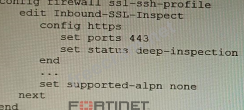 The supported-alpn parameter is set to http1.1 in the SSL inspection profile. This means that the FortiGate will only accept HTTP/1.1 traffic. Any HTTP/2 traffic will be rejected. The following is the relevant documentation from Fortinet: The supported-alpn parameter specifies the list of ALPN protocols that the FortiGate will accept. If the client requests a protocol that is not in this list, the FortiGate will reject the connection. The default value for the supported-alpn parameter is all. This means that the FortiGate will accept any ALPN protocol that the client requests. To reject all HTTP/2 traffic, set the supported-alpn parameter to http1.1. Source: https://docs.fortinet.com/document/fortigate/7.0.0/new-features/710924/http-2-support-in-proxy-mode-ssl-inspection